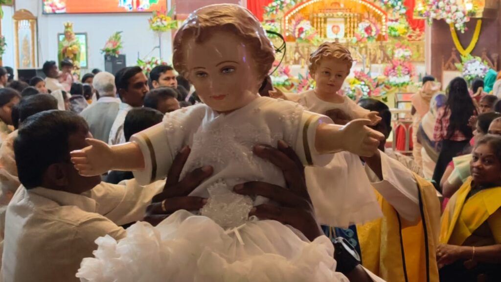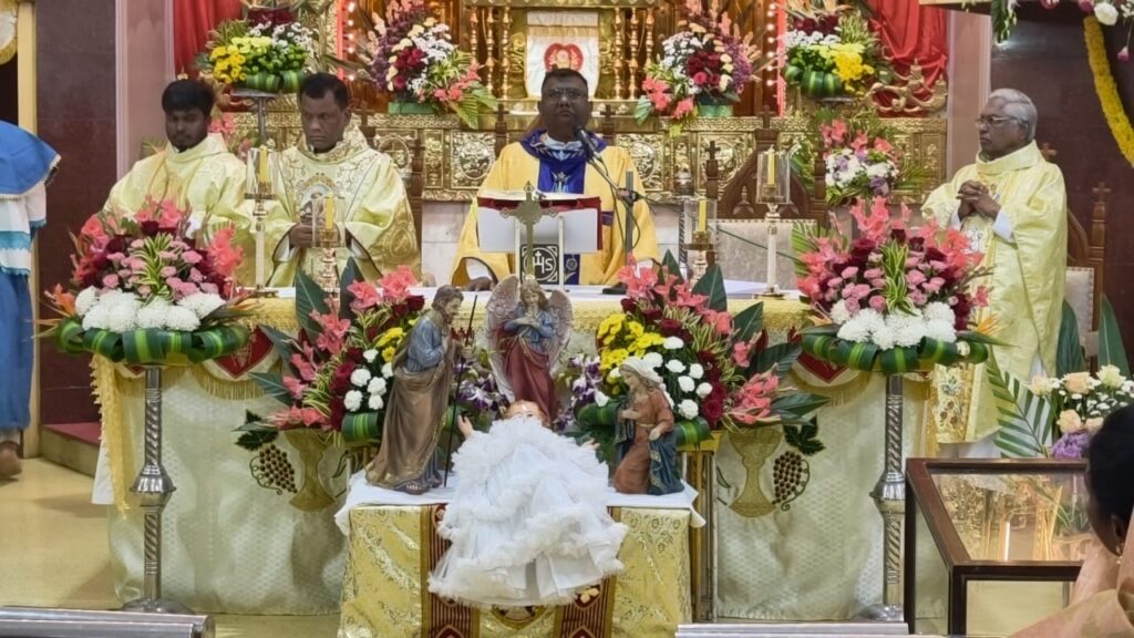 கோவை மறை மாவட்ட ஆயர் தாமஸ் ஆக்வினஸ் தலைமையில் நடைபெற்ற திருப்பலியில் குழந்தை இயேசு உருவபொம்மையை பக்தர்களுக்கு உயர்த்திக் காட்டி இயேசு பிறப்பை அறிவித்தார். பின்னர் அந்த உருவபொம்மை குடிலில் வைக்கப்பட்டு ஆராதனைகள் மற்றும் சிறப்பு திருப்பலி நடைபெற்றது.