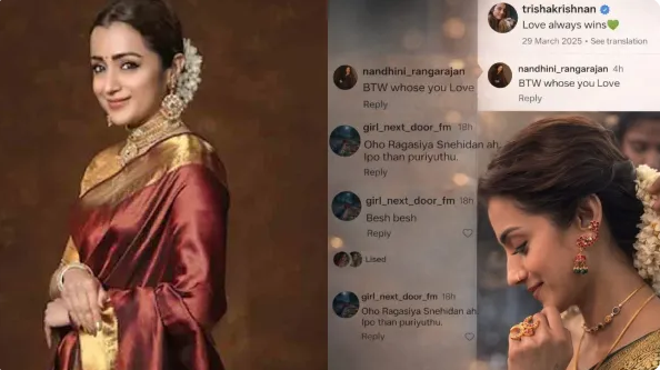 கடந்த 2025ஆம் ஆண்டு மார்ச் மாதத்தில் திரிஷா ஒரு பதிவை போட்டார். அதில் அவர் சேலையுடன் வெட்கி தலை குனிந்திருப்பது போலவும், அவர் தலையில் மல்லிகைப்பூவை யாரோ ஒருவர் வைப்பதும் போல அந்த புகைப்படம் இருந்தது.