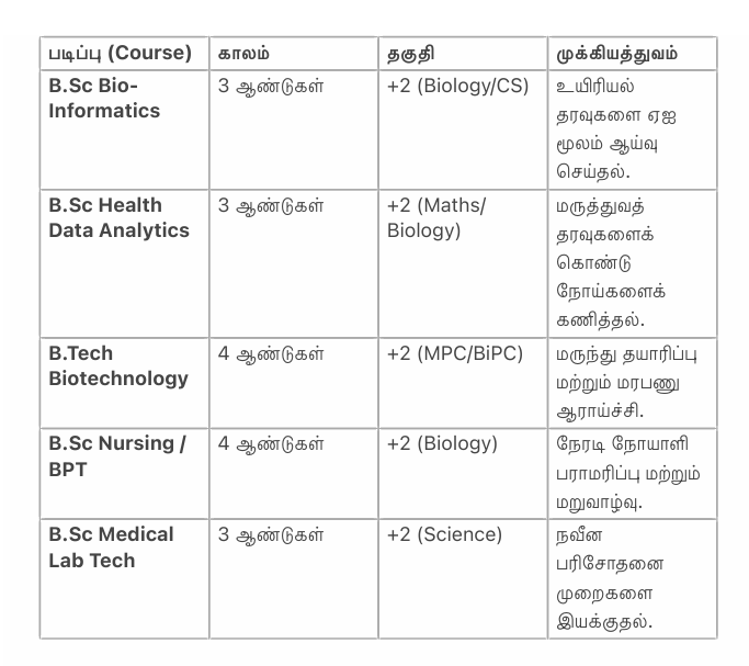 இன்றைய சூழலில் வெறும் மருத்துவ அறிவு மட்டும் போதாது; டேட்டா அனலிட்டிக்ஸ் மற்றும் மெஷின் லேர்னிங் தெரிந்த மாணவர்களுக்குத் தான் அதிக முன்னுரிமை அளிக்கப்படுகிறது. - சம்பள விவரம்: இத்துறை சார்ந்த வல்லுநர்களுக்குத் தொடக்கச் சம்பளமே ஆண்டுக்கு ₹6 லட்சம் முதல் ₹12 லட்சம் வரை வழங்கப்படுகிறது என்பது குறிப்பிடத்தக்கது.